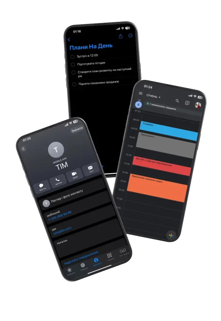 Усі контакти, календарі, нотатки та нагадування інтегровані в одному безпечному застосунку — ваш бізнес завжди під рукою.