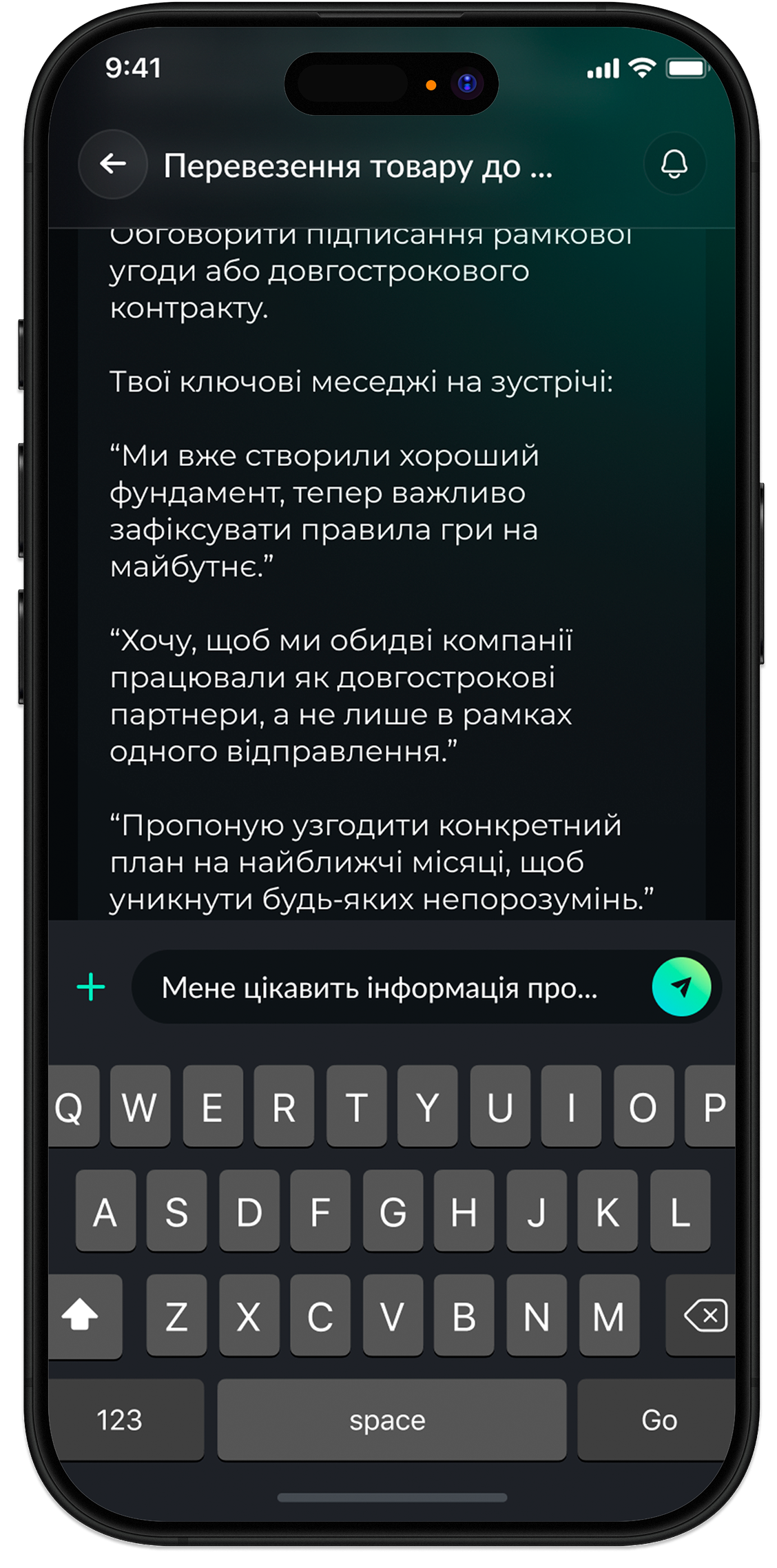 Отримуйте стислі й точні інсайти про партнера, його стиль та ключові факти, щоб упевнено входити в переговори навіть при обмеженому часі.